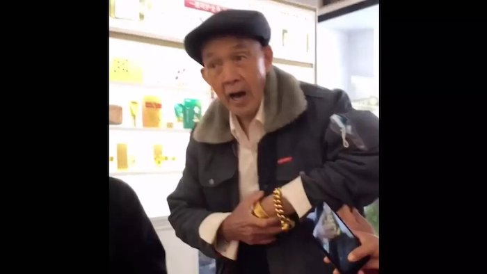 Вирално видео на кинеската верзија на TikTok Douyin покажува старец кој носи огромни златни нараквици и прстен. Снимен е во продавница во градот Жангжу во југоисточната кинеска провинција Фуџијан на 27 февруари, објави SCMP.